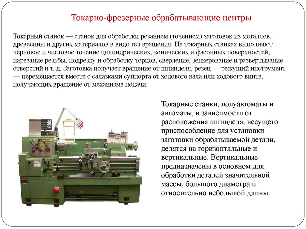 Токарно-фрезерные обрабатывающие центрыТока́рный стано́к — станок для обработки резанием (точением) заготовок из металлов,