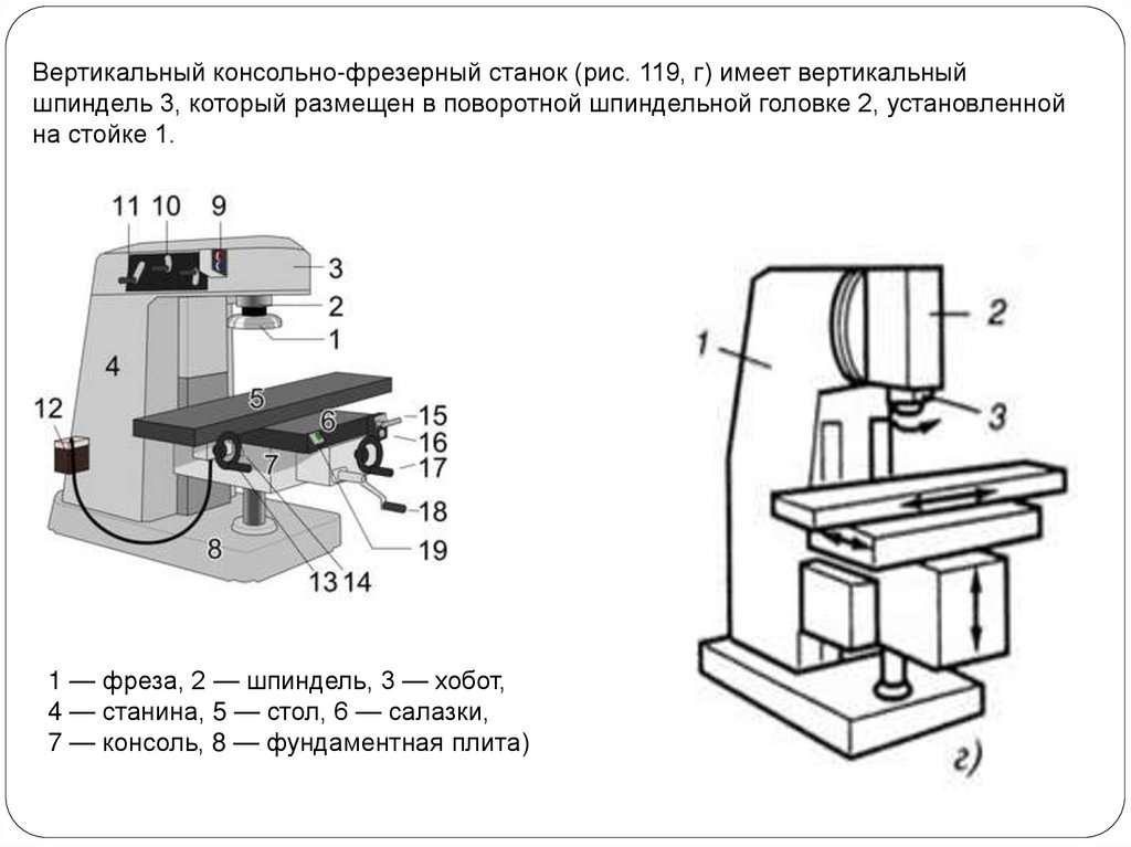 Вертикальный консольно-фрезерный станок (рис. 119, г) имеет вертикальныйшпиндель 3, который размещен в поворотной шпиндельной головке 2, установленной