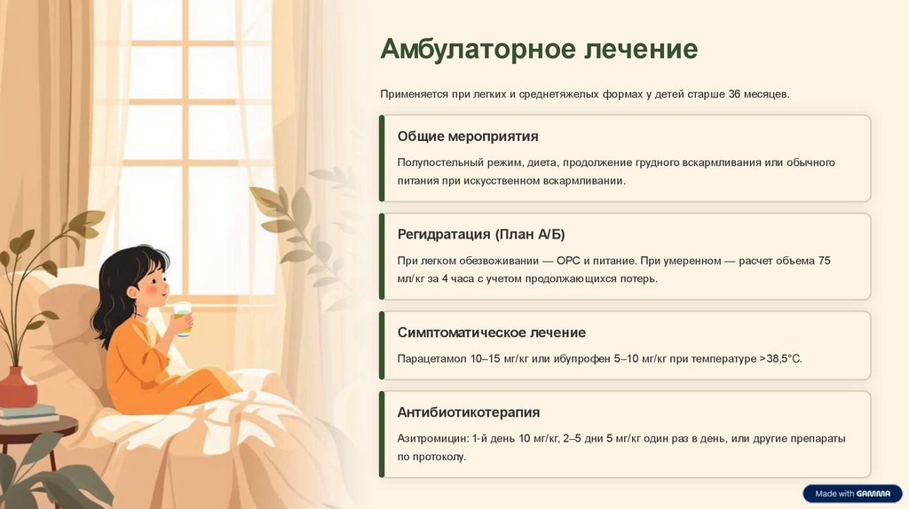 Амбулаторное лечениеПрименяется при легких и среднетяжелых формах у детей старше 36 месяцев.