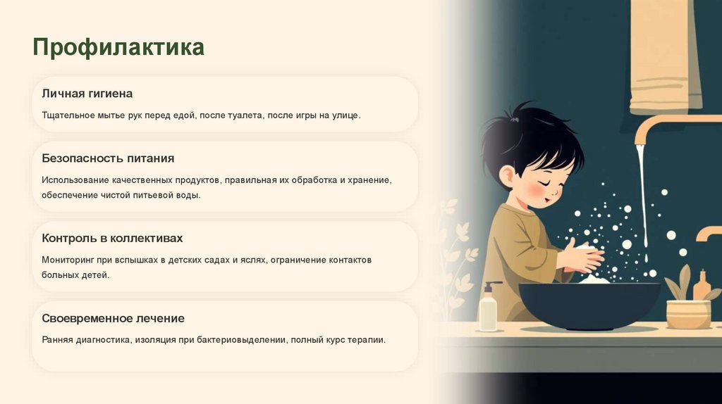 Ранняя диагностика, изоляция при бактериовыделении, полный курс терапии.