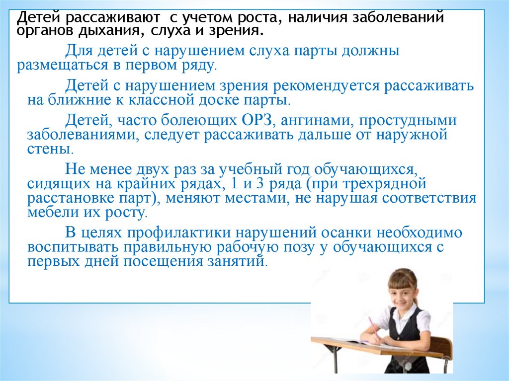Детей рассаживают с учетом роста, наличия заболеванийорганов дыхания, слуха и зрения.
