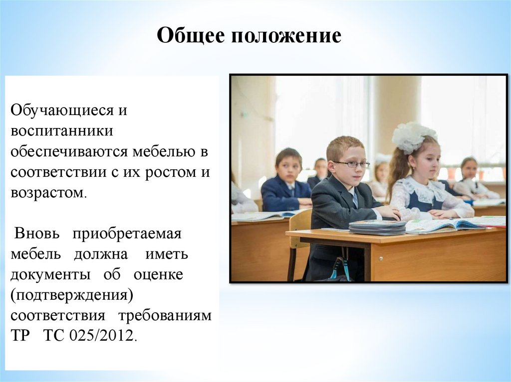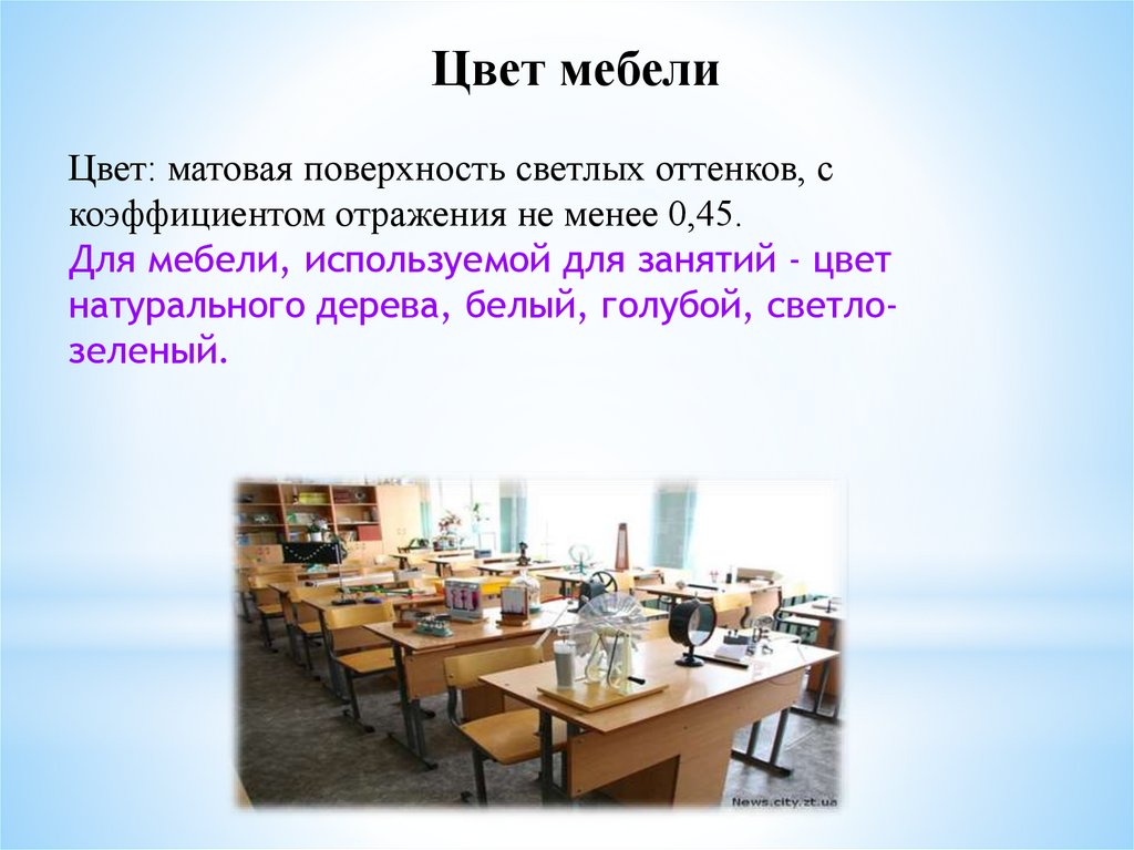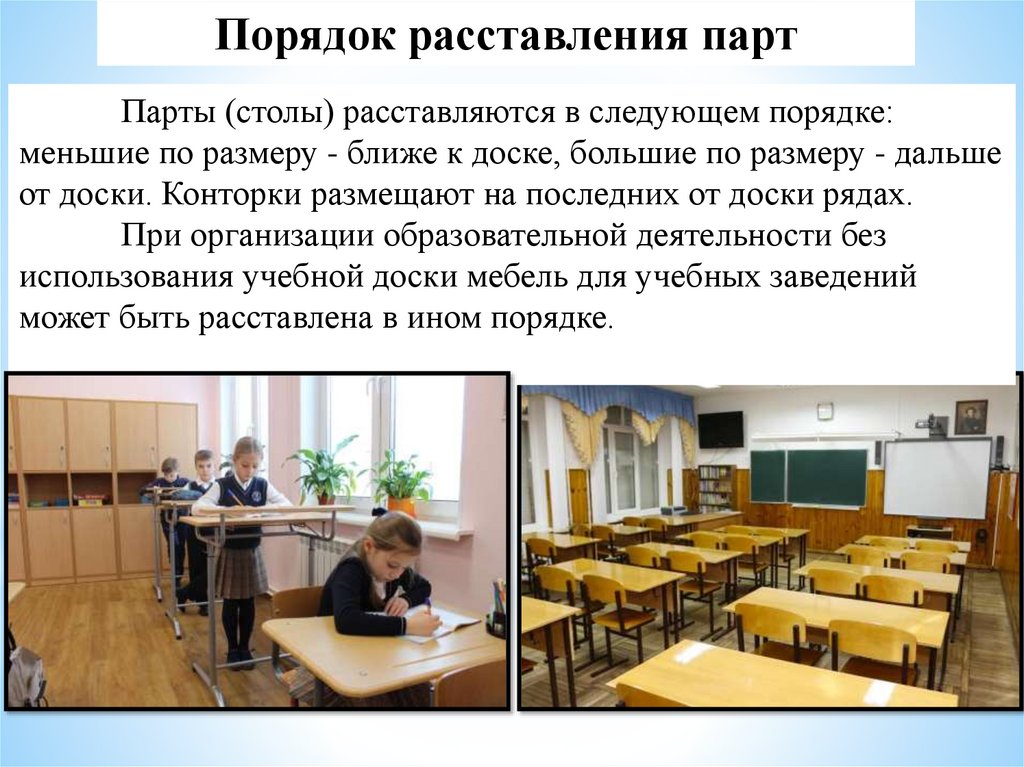 В зависимости от назначения учебных помещенийиспользуются различные виды мебели (парты, столы,