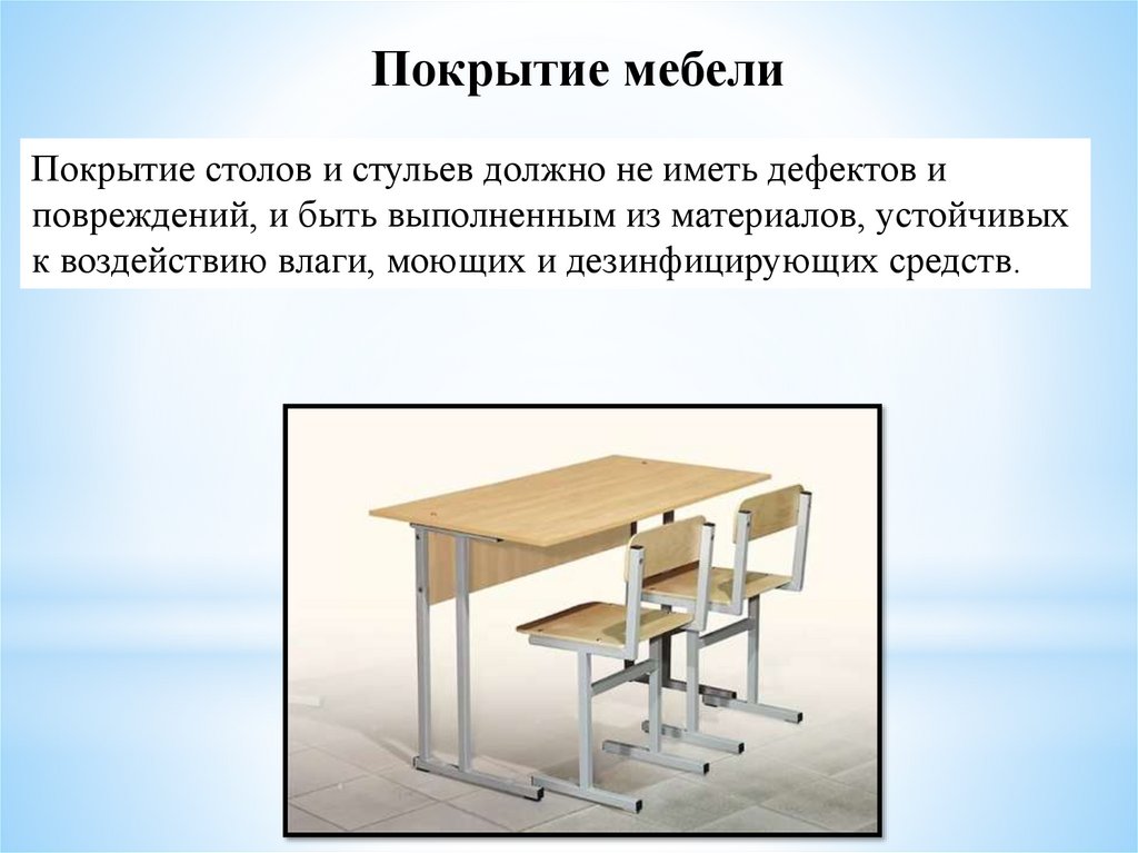 Покрытие мебелиПокрытие столов и стульев должно не иметь дефектов и
