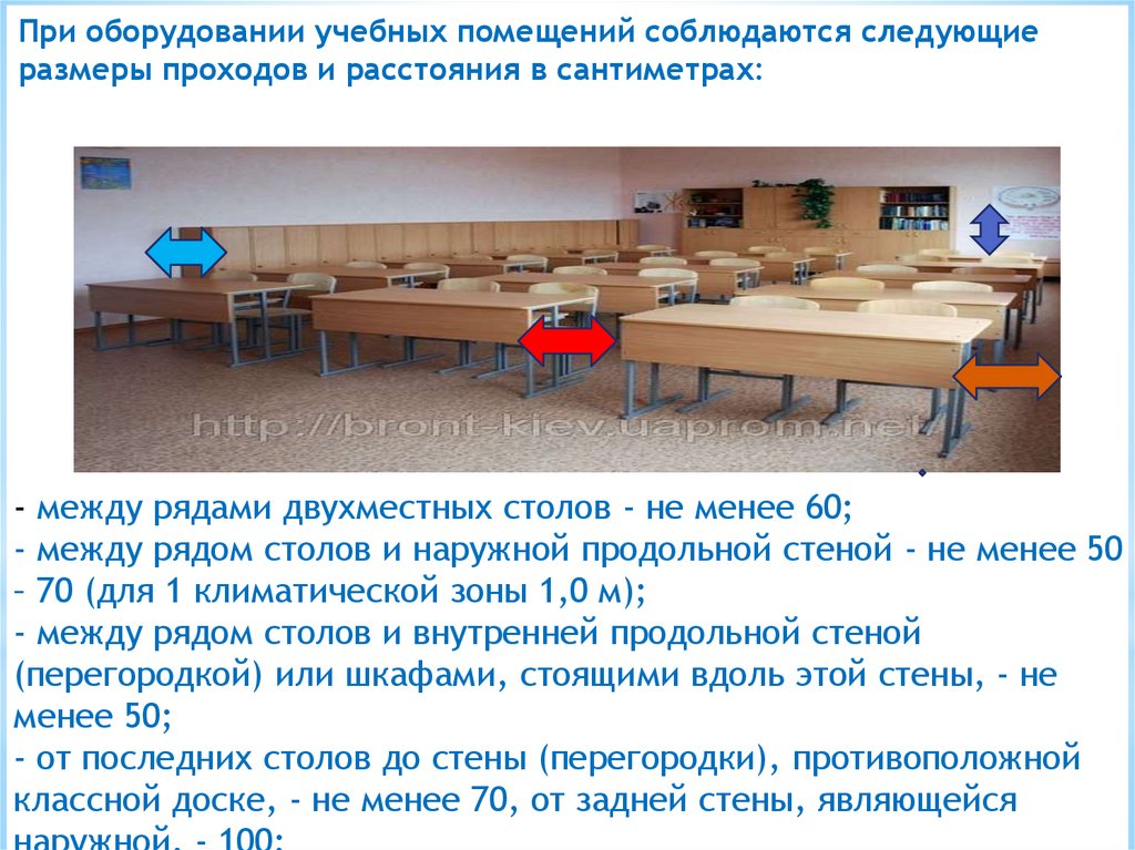 При оборудовании учебных помещений соблюдаются следующиеразмеры проходов и расстояния в сантиметрах: