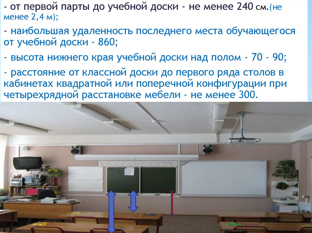 - от первой парты до учебной доски - не менее 240 см.(неменее 2,4 м);