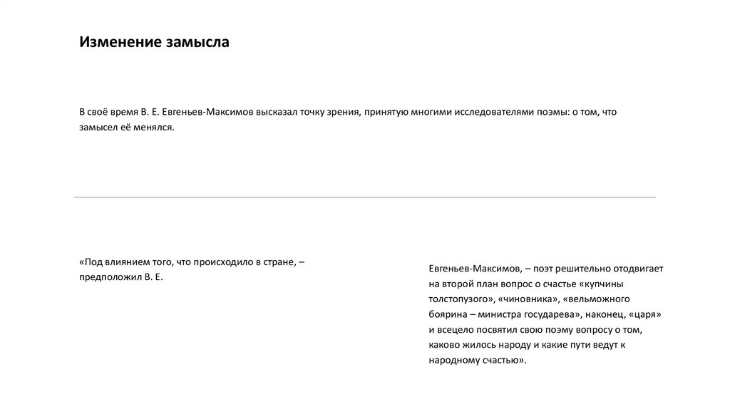 Изменение замыслаВ своё время В. Е. Евгеньев-Максимов высказал точку зрения, принятую многими исследователями поэмы: о том, что