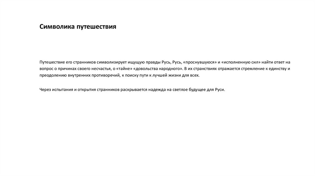 Символика путешествияПутешествие его странников символизирует ищущую правды Русь, Русь, «проснувшуюся» и «исполненную сил» найти ответ на