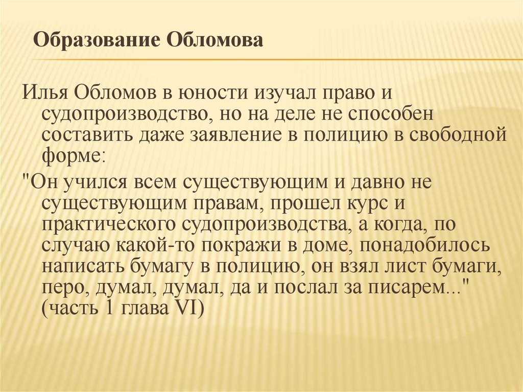 Образование ОбломоваИлья Обломов в юности изучал право и