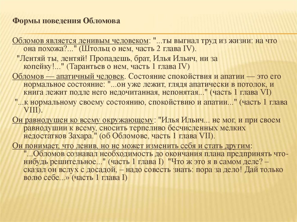 Формы поведения ОбломоваОбломов является ленивым человеком: "...ты выгнал труд из жизни: на что