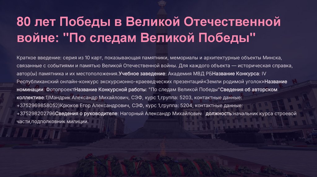 автор(ы) памятника и их местоположения.Учебное заведение: Академия МВД РБНазвание Конкурса: IV