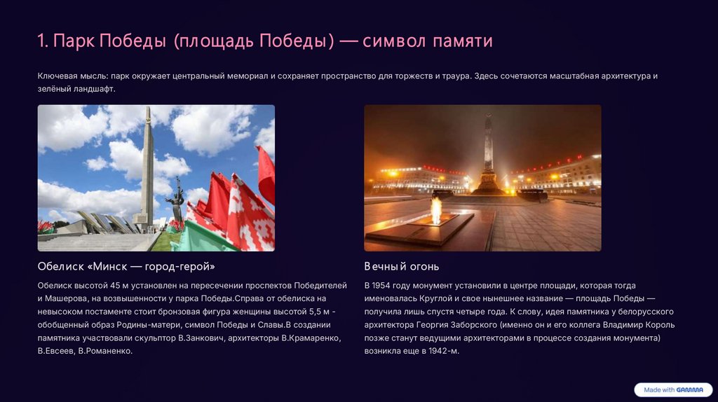 1. Парк Победы (площадь Победы ) — символ памятиКлючевая мысль: парк окружает центральный мемориал и сохраняет пространство для торжеств и траура. Здесь сочетаются масштабная архитектура и
