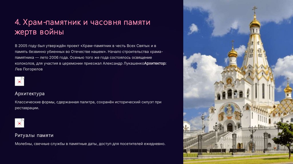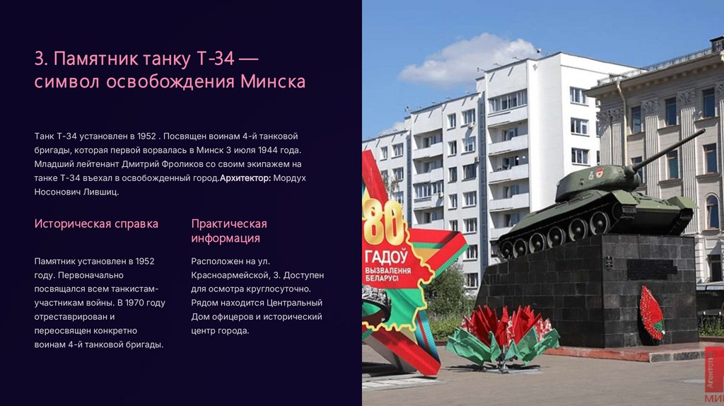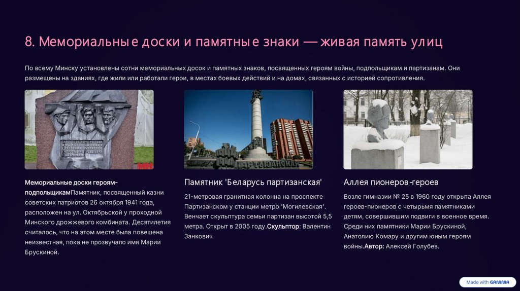 8. Мемориальны е доски и памятны е знаки — живая память ул ицПо всему Минску установлены сотни мемориальных досок и памятных знаков, посвященных героям войны, подпольщикам и партизанам. Они