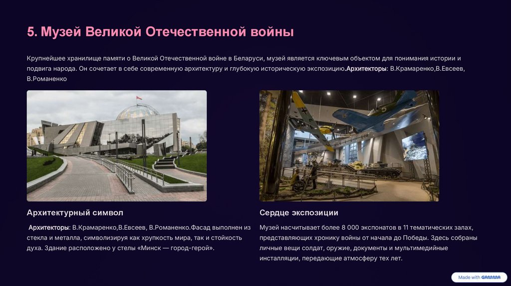 5. Музей Великой Отечественной войныКрупнейшее хранилище памяти о Великой Отечественной войне в Беларуси, музей является ключевым объектом для понимания истории и
