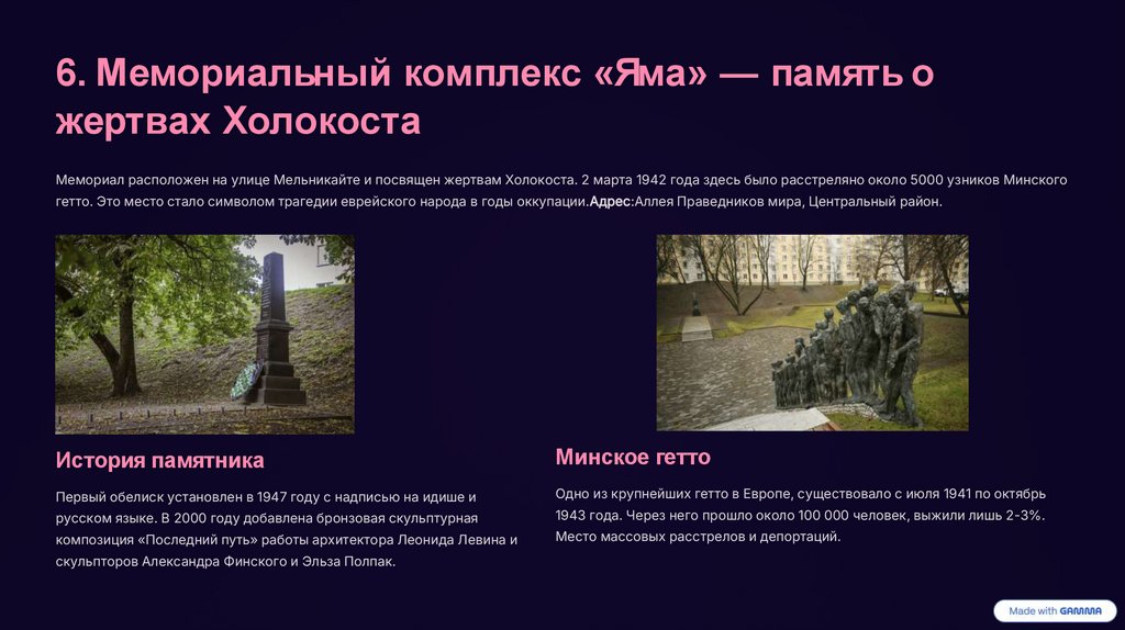 гетто. Это место стало символом трагедии еврейского народа в годы оккупации.Адрес:Аллея Праведников мира, Центральный район.