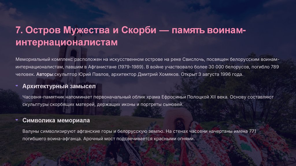 7. Остров Мужества и Скорби — память воинаминтернационалистамМемориальный комплекс расположен на искусственном острове на реке Свислочь, посвящен белорусским воинаминтернационалистам, павшим в Афганистане (1979-1989). В войне участвовало более 30 000 белорусов, погибло 789