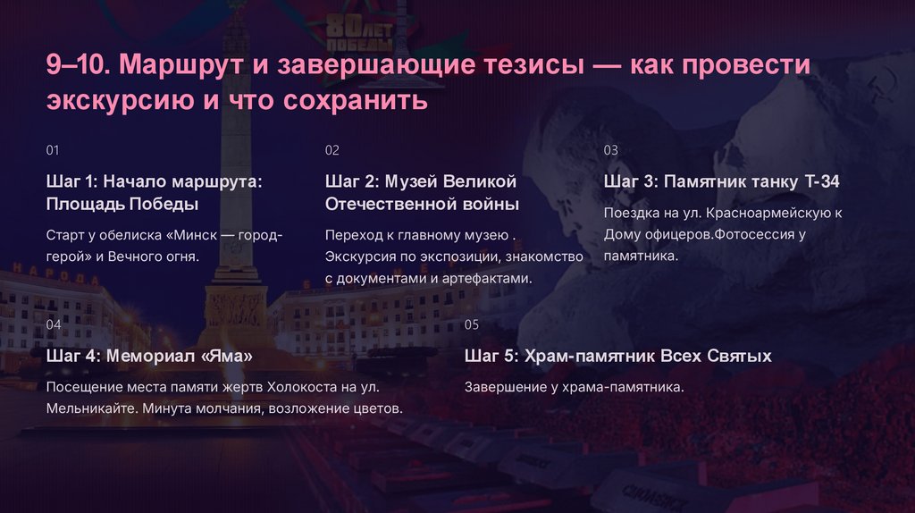 9–10. Маршрут и завершающие тезисы — как провестиэкскурсию и что сохранить