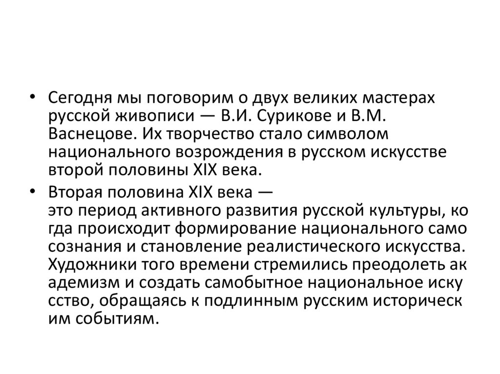 • Сегодня мы поговорим о двух великих мастерахрусской живописи — В.И. Сурикове и В.М.