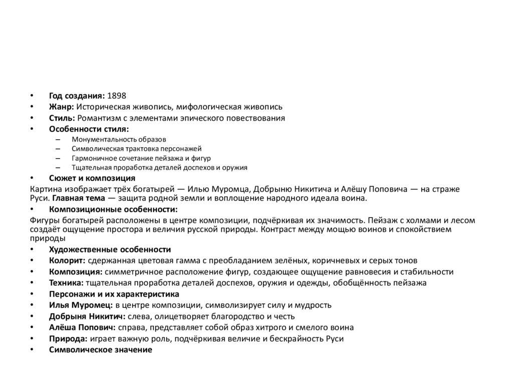 Картина изображает трёх богатырей — Илью Муромца, Добрыню Никитича и Алёшу Поповича — на страже
