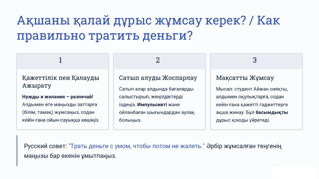 Русский совет: "Трать деньги с умом, чтобы потом не жалеть." Әрбір жұмсалған теңгенің