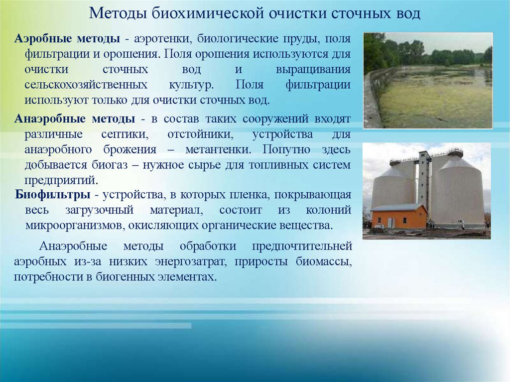 Методы биохимической очистки сточных водАэробные методы - аэротенки, биологические пруды, поля
