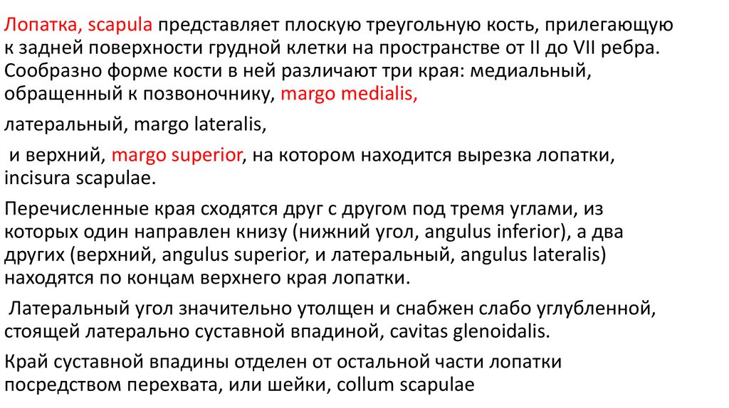Лопатка, scapula представляет плоскую треугольную кость, прилегающуюк задней поверхности грудной клетки на пространстве от II до VII ребра.