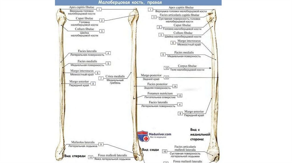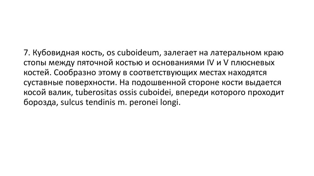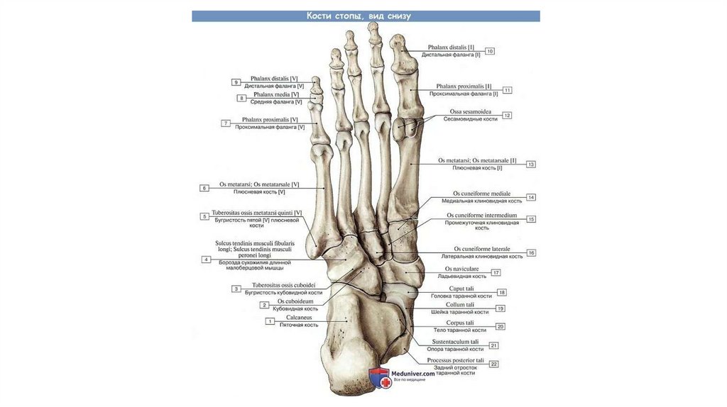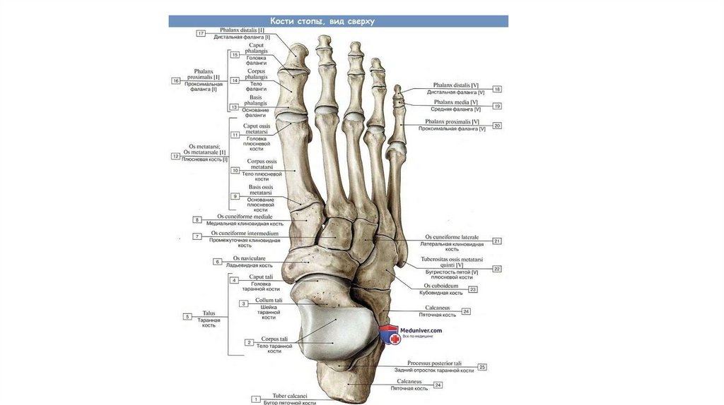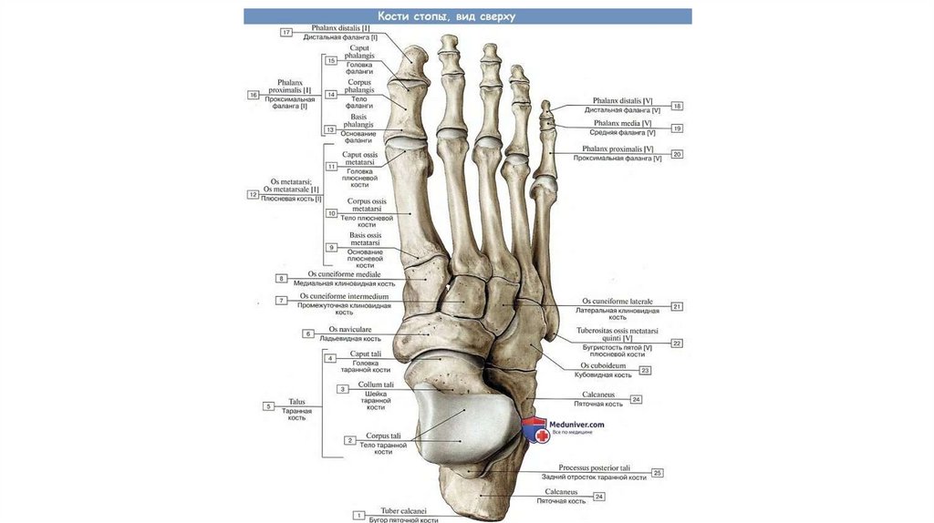 intermedium, laterale, os cuboideum, ossa metatarsalia I, II, III, IV, V. Из