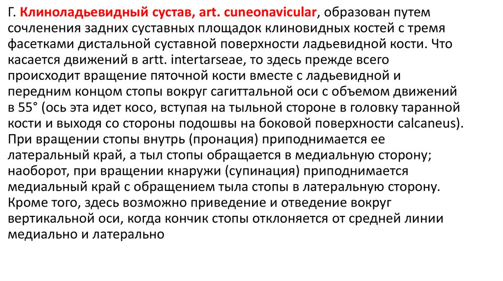 Г. Клиноладьевидный сустав, art. cuneonavicular, образован путемсочленения задних суставных площадок клиновидных костей с тремя