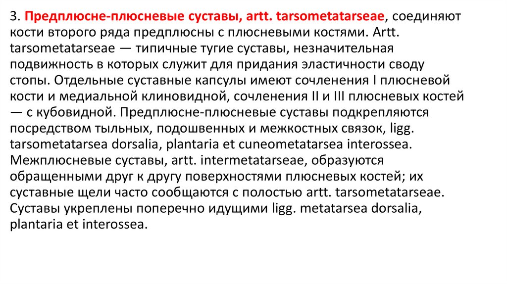 3. Предплюсне-плюсневые суставы, artt. tarsometatarseae, соединяюткости второго ряда предплюсны с плюсневыми костями. Artt.