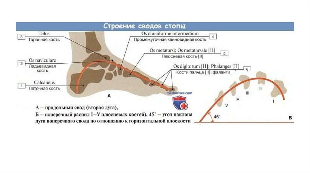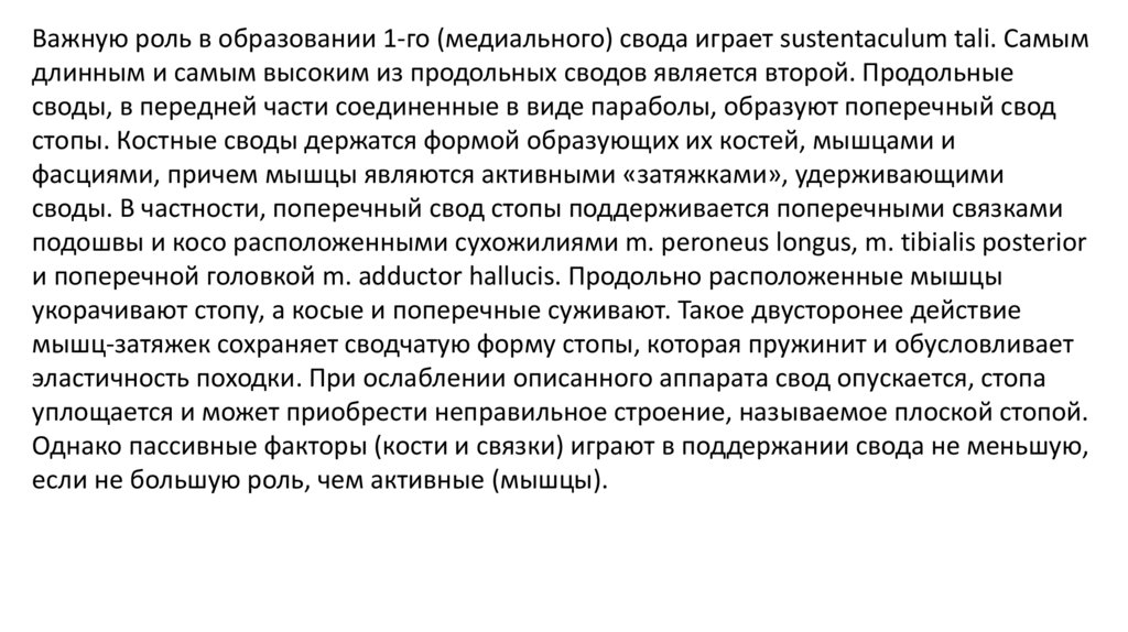 Важную роль в образовании 1-го (медиального) свода играет sustentaculum tali. Самымдлинным и самым высоким из продольных сводов является второй. Продольные