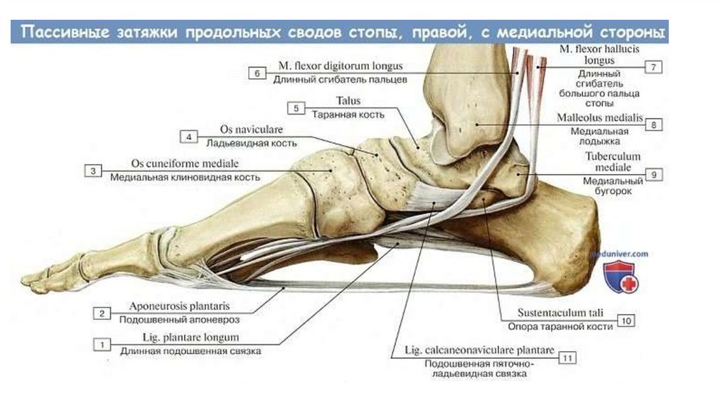 мышц-затяжек сохраняет сводчатую форму стопы, которая пружинит и обусловливает