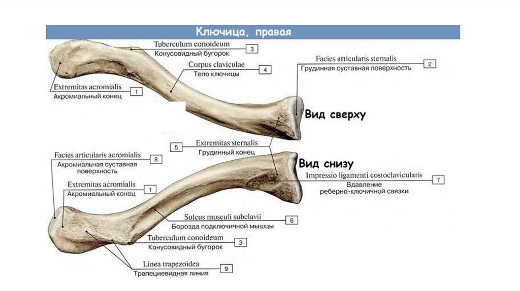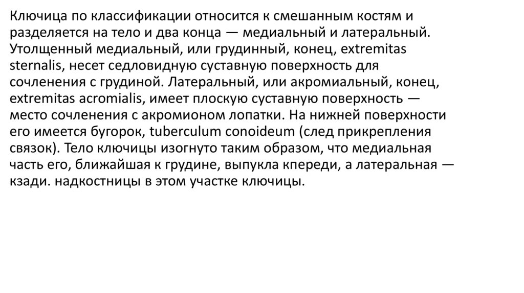 Ключица по классификации относится к смешанным костям иразделяется на тело и два конца — медиальный и латеральный.