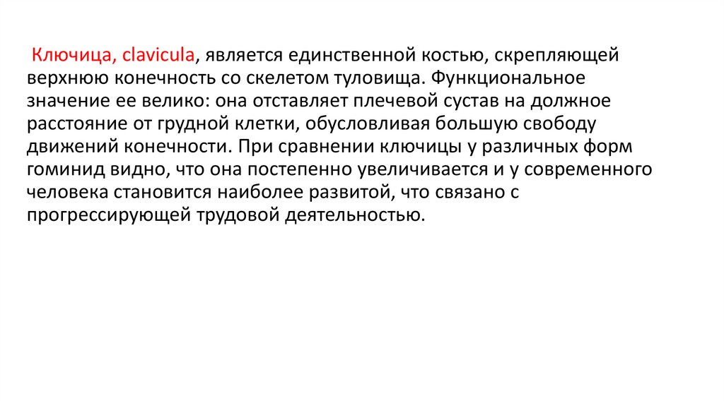 Ключица, clavicula, является единственной костью, скрепляющейверхнюю конечность со скелетом туловища. Функциональное