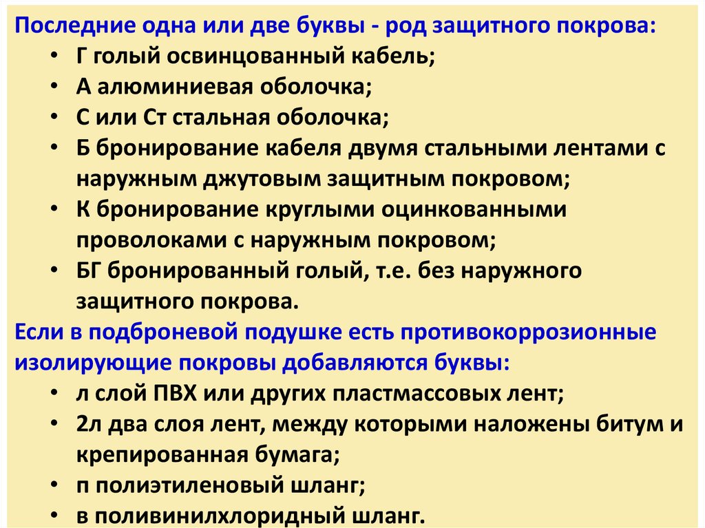 Последние одна или две буквы - род защитного покрова:• Г голый освинцованный кабель;