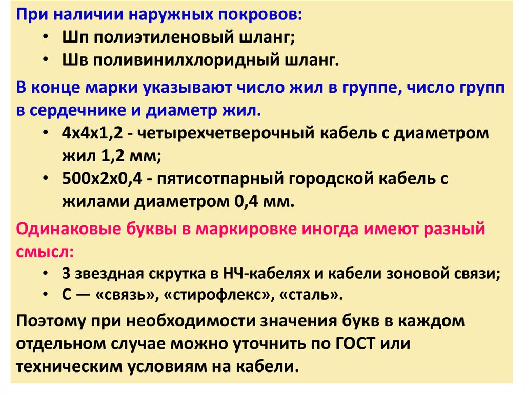 При наличии наружных покровов:• Шп полиэтиленовый шланг;