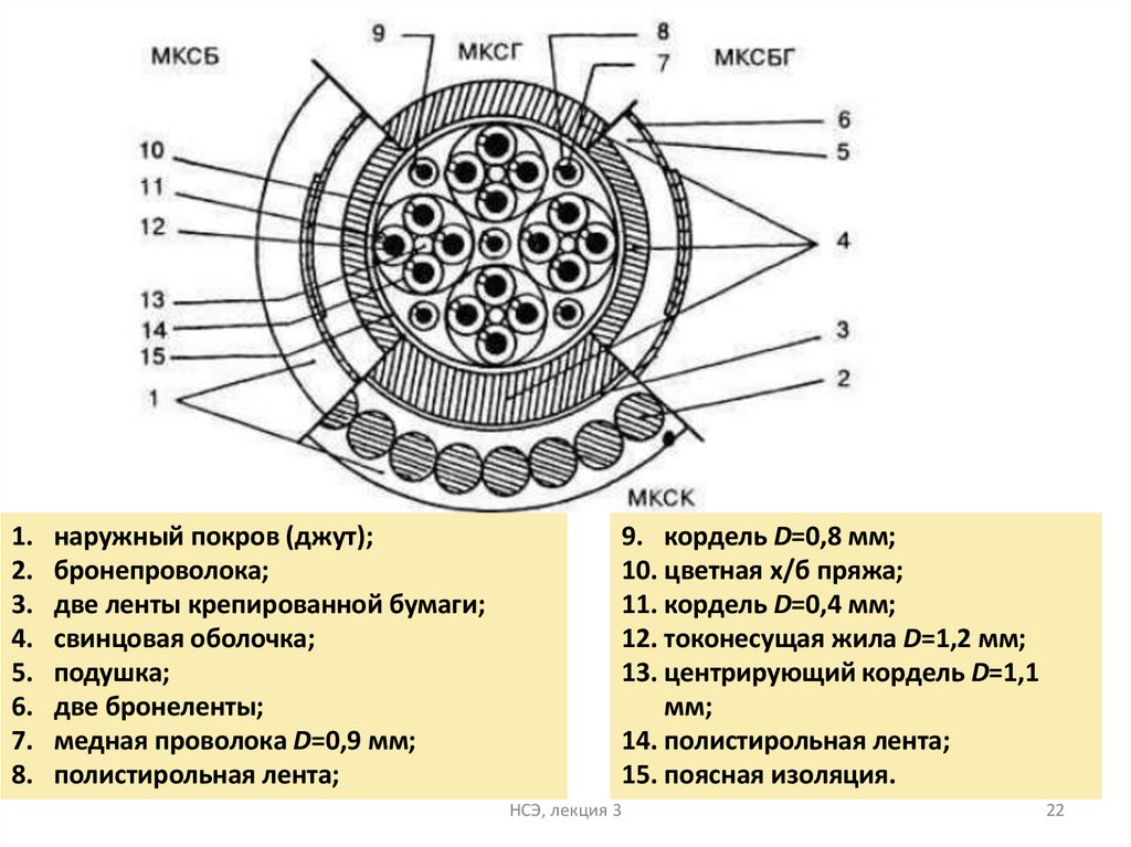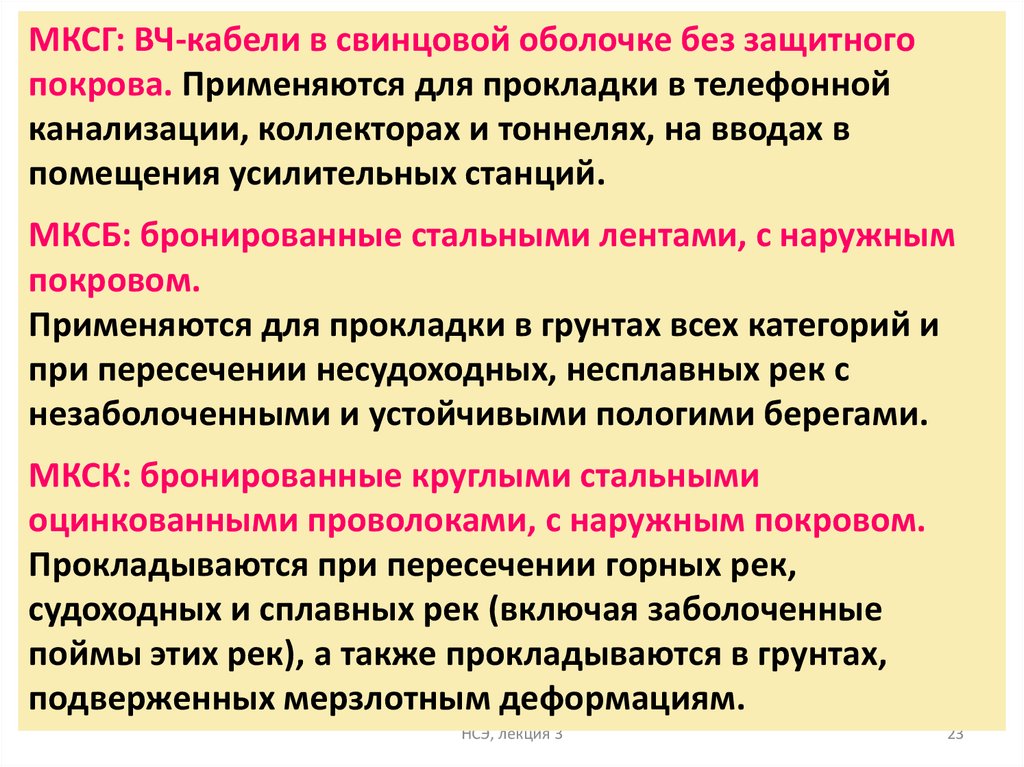МКСГ: ВЧ-кабели в свинцовой оболочке без защитногопокрова. Применяются для прокладки в телефонной
