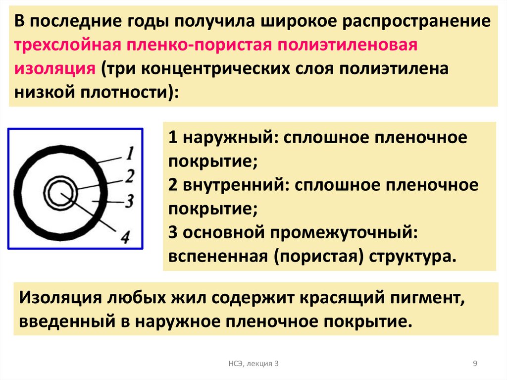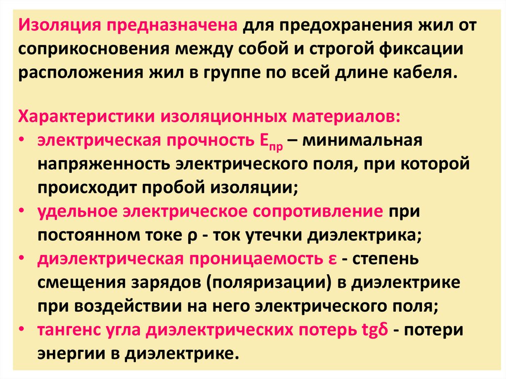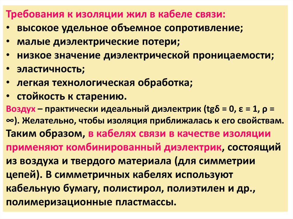 Требования к изоляции жил в кабеле связи:• высокое удельное объемное сопротивление;