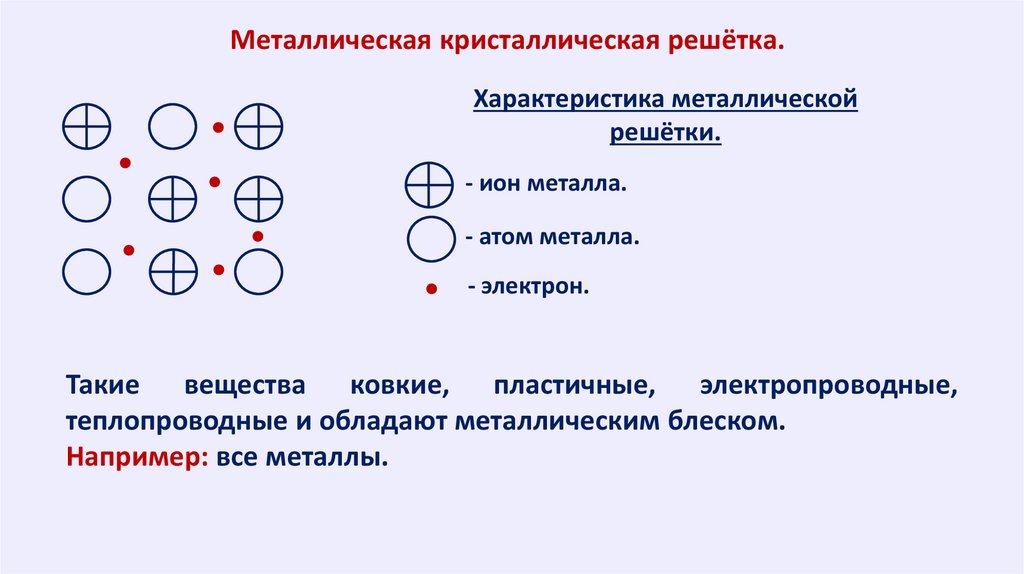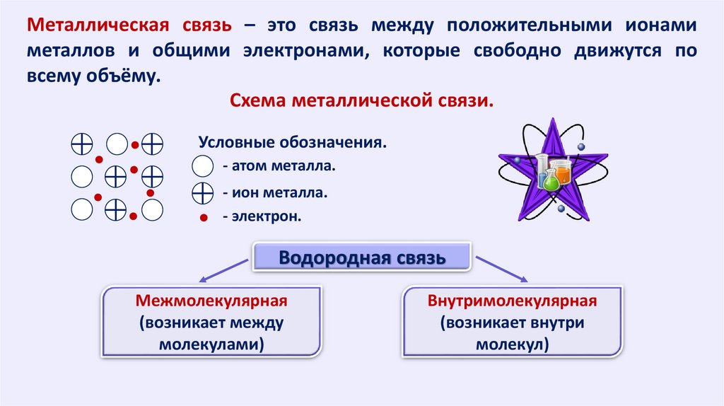 Металлическая связь – это связь между положительными ионамиметаллов и общими электронами, которые свободно движутся по