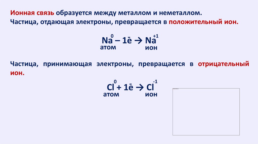 Ионная связь образуется между металлом и неметаллом.Частица, отдающая электроны, превращается в положительный ион.