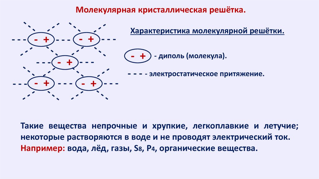 Молекулярная кристаллическая решётка.--- - + --- - + ----- - + ----- - + --- - + ---
