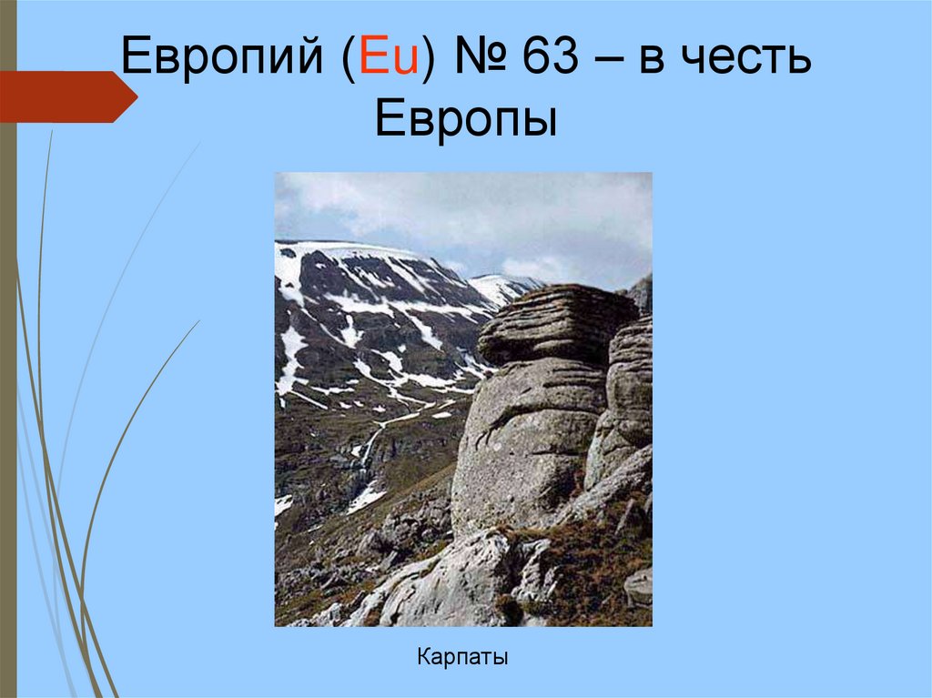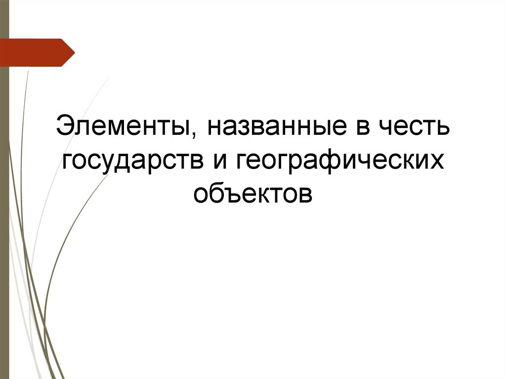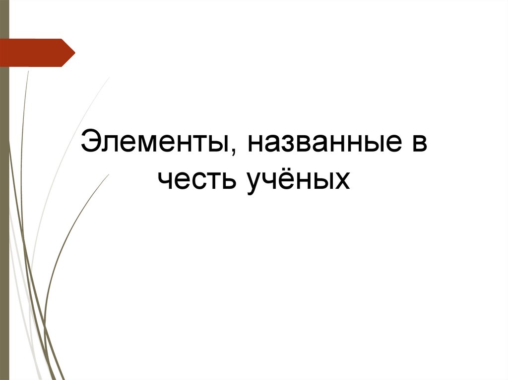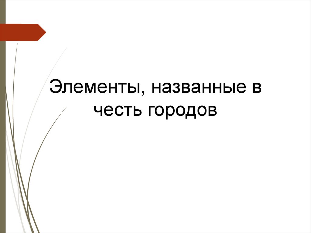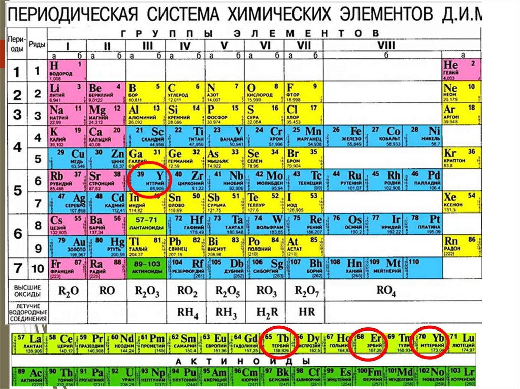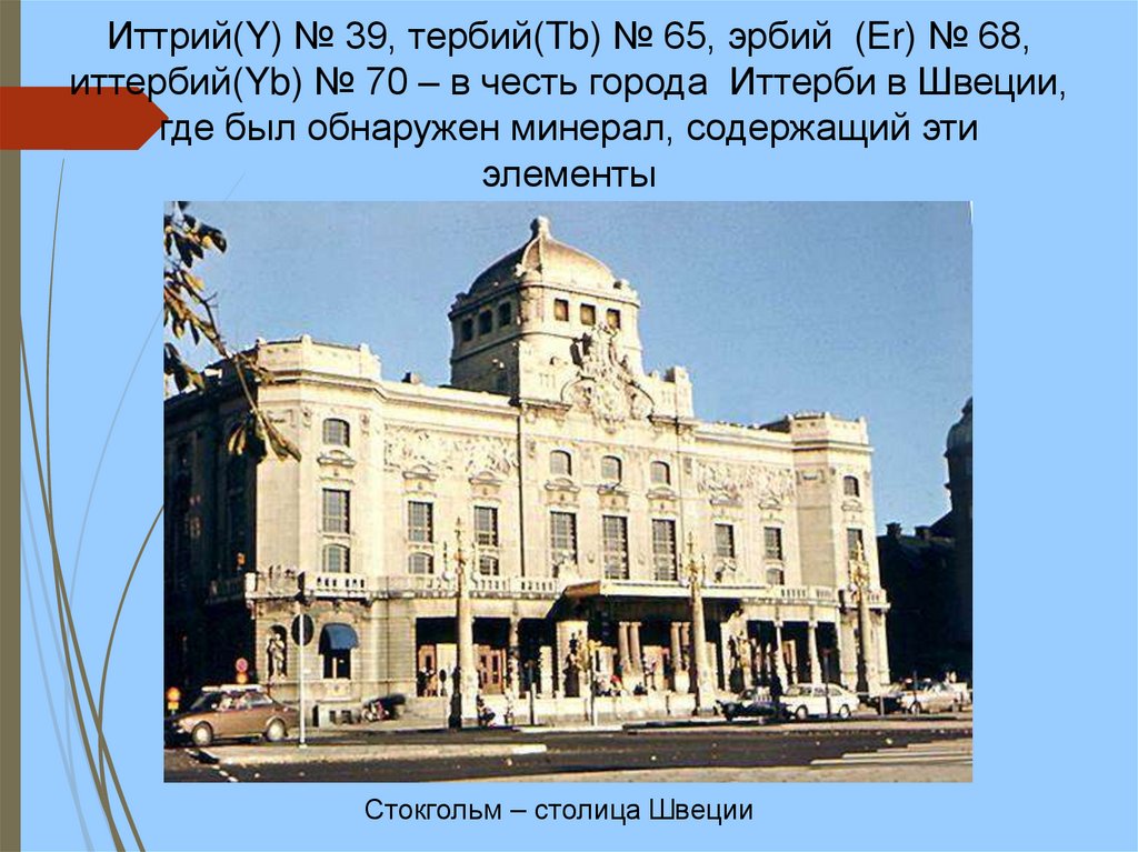 Иттрий(Y) № 39, тербий(Tb) № 65, эрбий (Er) № 68,иттербий(Yb) № 70 – в честь города Иттерби в Швеции,
