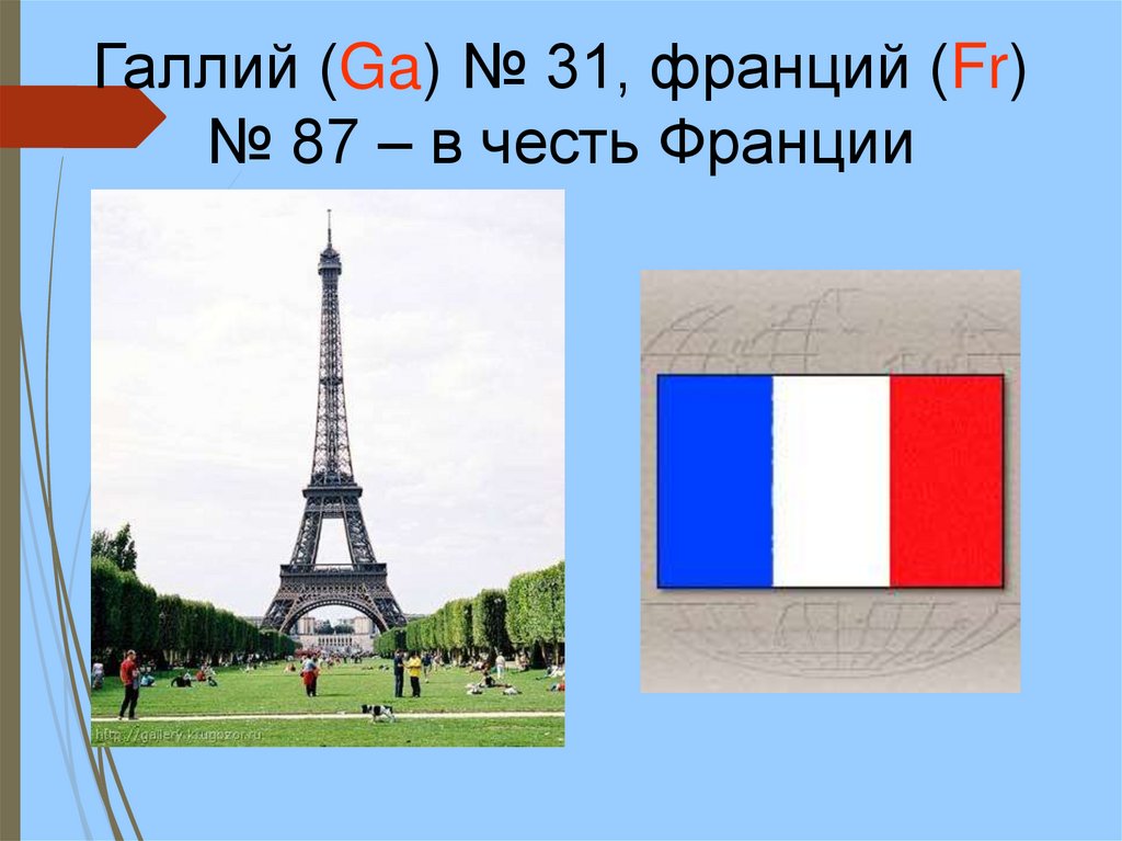 Галлий (Ga) № 31, франций (Fr)№ 87 – в честь Франции