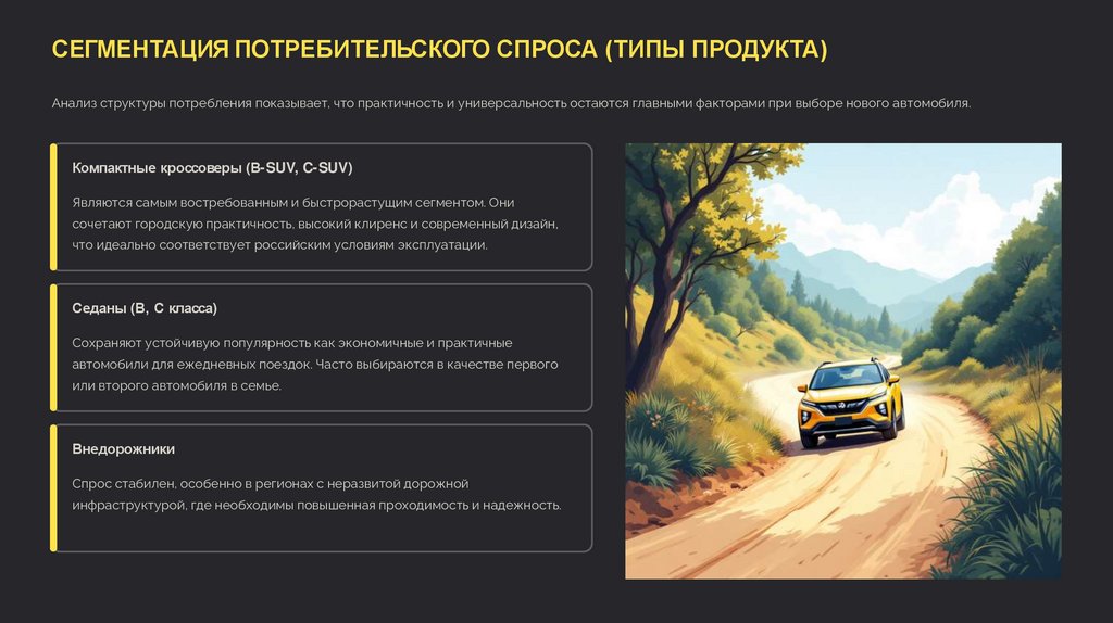 СЕГМЕНТАЦИЯ ПОТРЕБИТЕЛЬСКОГО СПРОСА (ТИПЫ ПРОДУКТА)Анализ структуры потребления показывает, что практичность и универсальность остаются главными факторами при выборе нового автомобиля.
