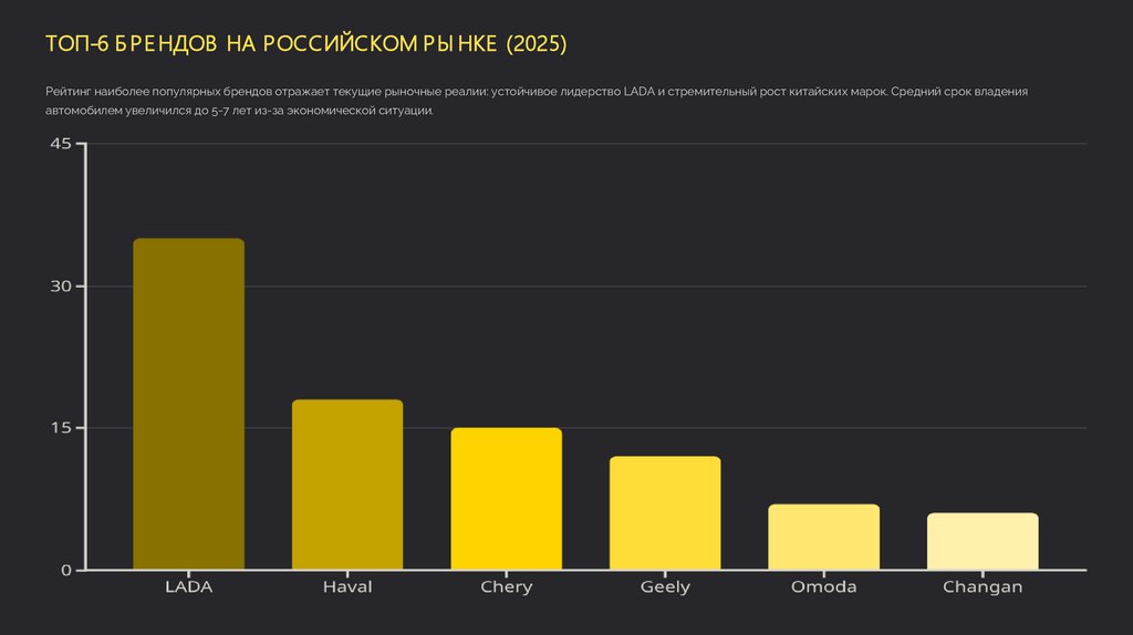 ТОП-6 Б РЕ НДОВ НА РОССИЙСКОМ Р Ы НКЕ (2025)Рейтинг наиболее популярных брендов отражает текущие рыночные реалии: устойчивое лидерство LADA и стремительный рост китайских марок. Средний срок владения