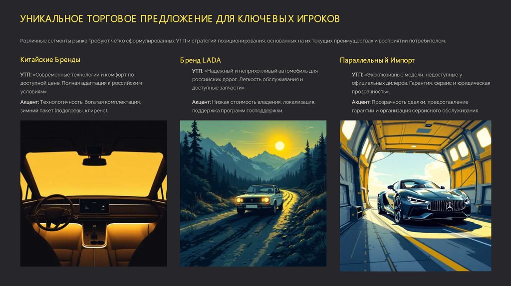 УНИКАЛЬНОЕ ТОРГОВ ОЕ ПРЕ ДЛОЖЕ НИЕ ДЛЯ КЛЮЧЕ В Ы Х ИГРОКОВРазличные сегменты рынка требуют четко сформулированных УТП и стратегий позиционирования, основанных на их текущих преимуществах и восприятии потребителем.