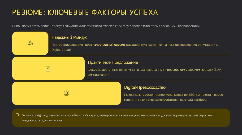 Р Е ЗЮМЕ : КЛЮЧЕ В Ы Е ФАКТОР Ы УСПЕ ХАРынок новых автомобилей требует гибкости и адаптивности. Успех в 2024 году определяется тремя основными направлениями.