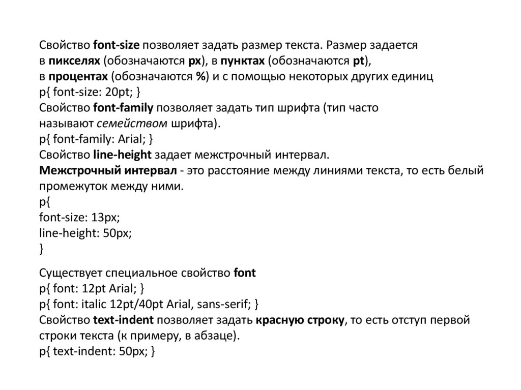 Свойство font-size позволяет задать размер текста. Размер задаетсяв пикселях (обозначаются px), в пунктах (обозначаются pt),