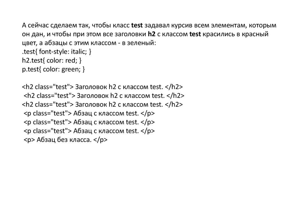 А сейчас сделаем так, чтобы класс test задавал курсив всем элементам, которымон дан, и чтобы при этом все заголовки h2 с классом test красились в красный