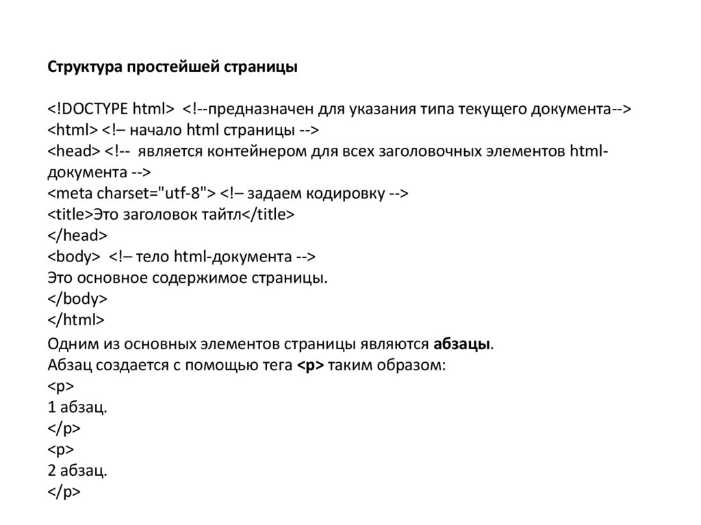 Структура простейшей страницы<!DOCTYPE html> <!--предназначен для указания типа текущего документа-->