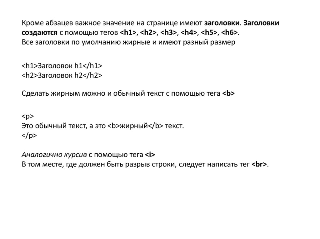 Кроме абзацев важное значение на странице имеют заголовки. Заголовкисоздаются с помощью тегов <h1>, <h2>, <h3>, <h4>, <h5>, <h6>.