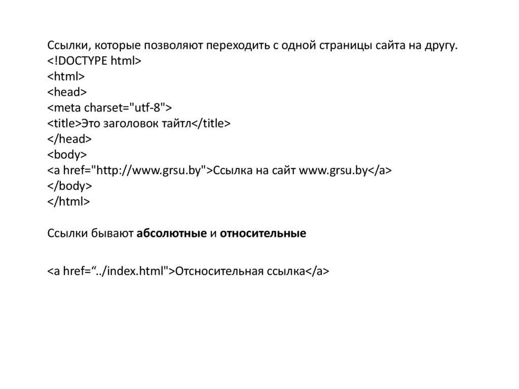 Ссылки, которые позволяют переходить с одной страницы сайта на другу.<!DOCTYPE html>